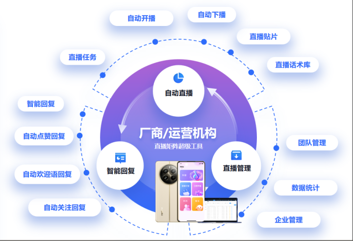 多平台与多账号管理:云客直播手机支持抖音、快手、小红书等多平台直播,满足不同平台的受众需求。同时,支持多个账号的统一管理和数据统计,方便企业进行账号运营。可设置直播任务,包括直播时间、内容、话术等,实现自动开播和停播。